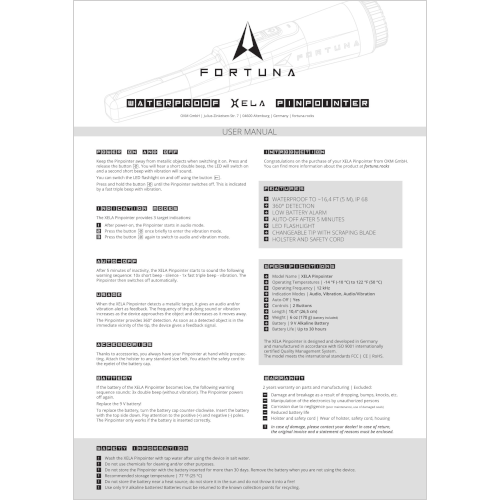 FORTUNA Pinpointer XELA, küçük metal nesneleri bulmak için kullanışlı bir metal dedektörüdür. Pinpointer define avları sırasında madeni paraların, anahtarların, alyansların ve hatta tarihi eserlerin tespitini kolaylaştırır ve değerli nesneleri kazma aletlerinin neden olduğu hasarlardan korur.